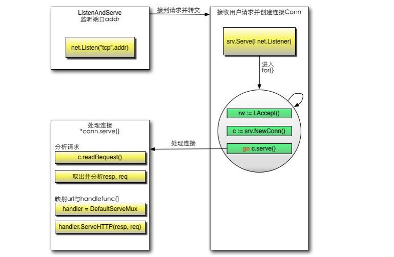 http.ListenAndServe通过net.Listen建立tcpListener,服务端可以进入accept循环,只要有listenFD上有accept新的TCPconn,每个TCPconn会通过newConn封装为一个server侧的httpConn,并通过new goroutine分发这次httpConn的相关处理。看起来go server是同步阻塞的方式,相关原理可参考我之前写的IO多路复用与Go网络库的实现。最外层的过程如图所示,下图转自go-web编程。